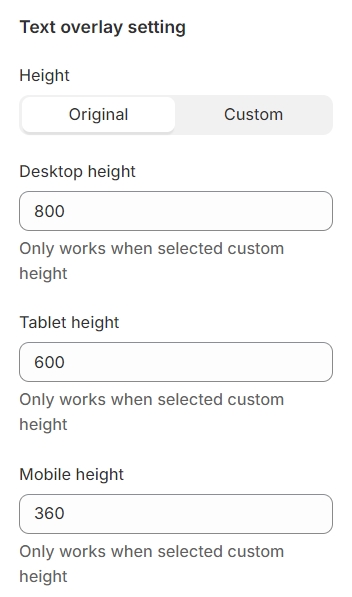For the text overlay setup, configure the height of the text content separately for desktop, tablet, and mobile devices, ensuring optimal readability and layout adaptation across various screen sizes.