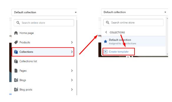 1. In the theme editor (**Customize**), use the page selector to open **Collections > Create template**.