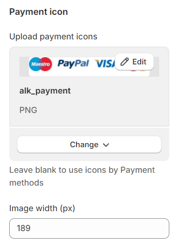 **Image Width:** Set the width of the payment icons to ensure they fit well within the layout and maintain visual consistency.