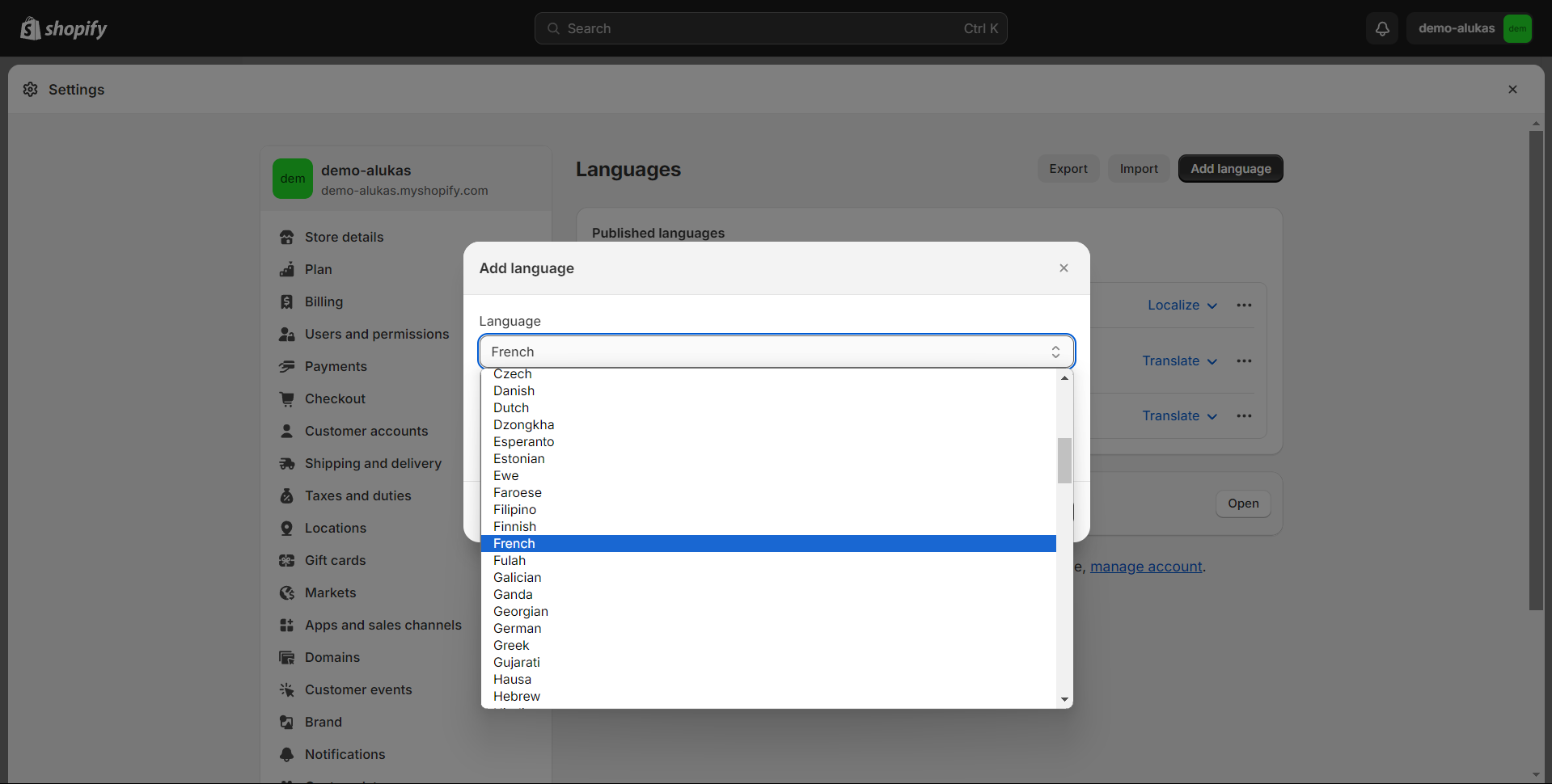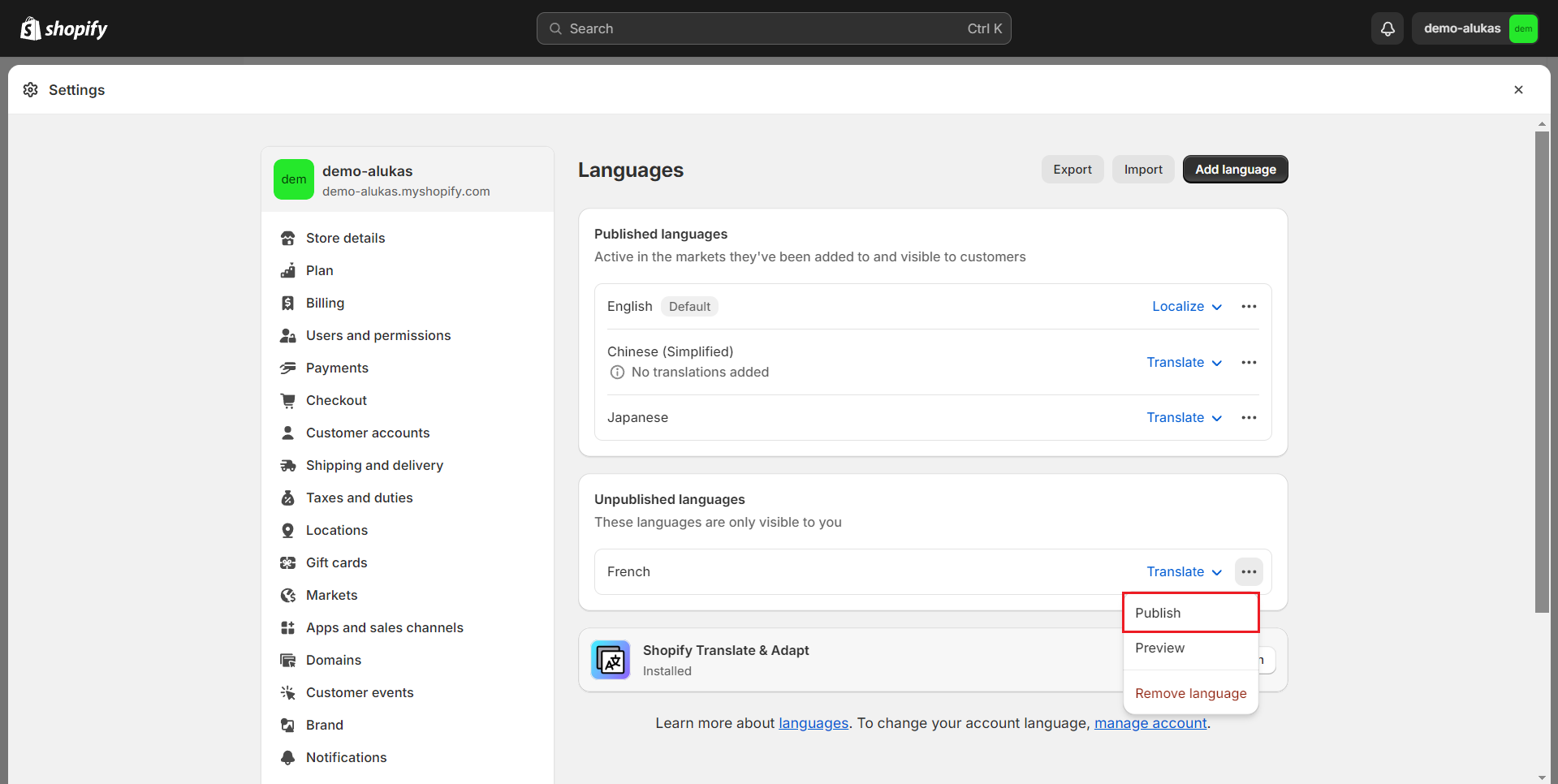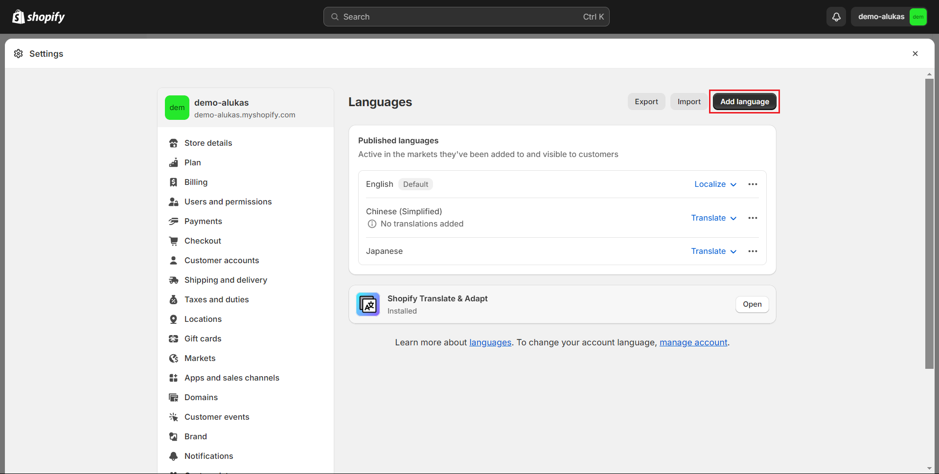* Go to **Settings -> Languages -> Add a language** to add a new language for your new market