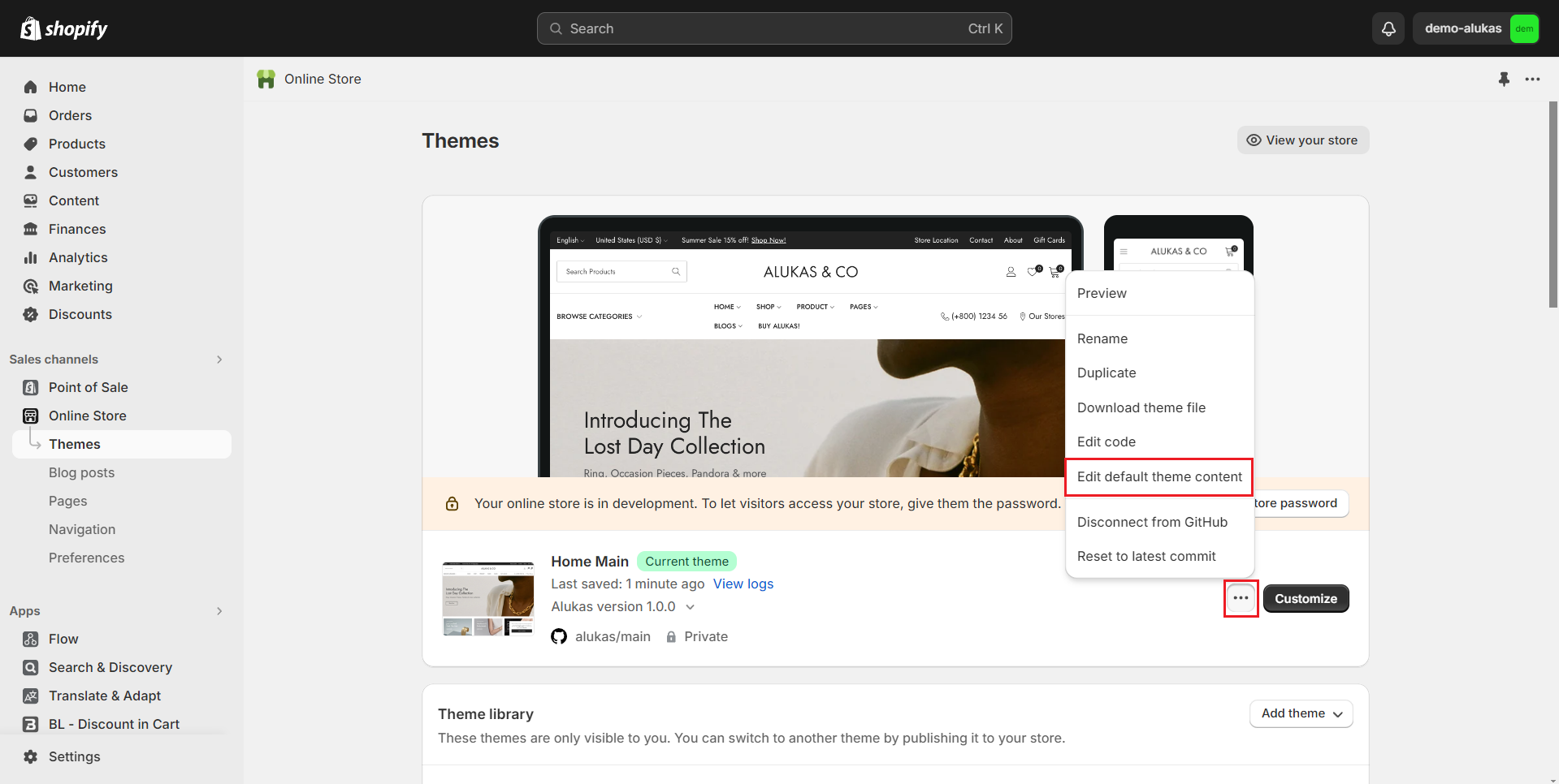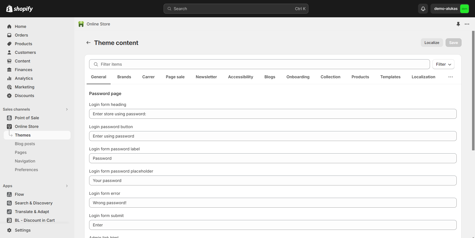 Go to **Online Store -> Themes -> Edit default theme content**