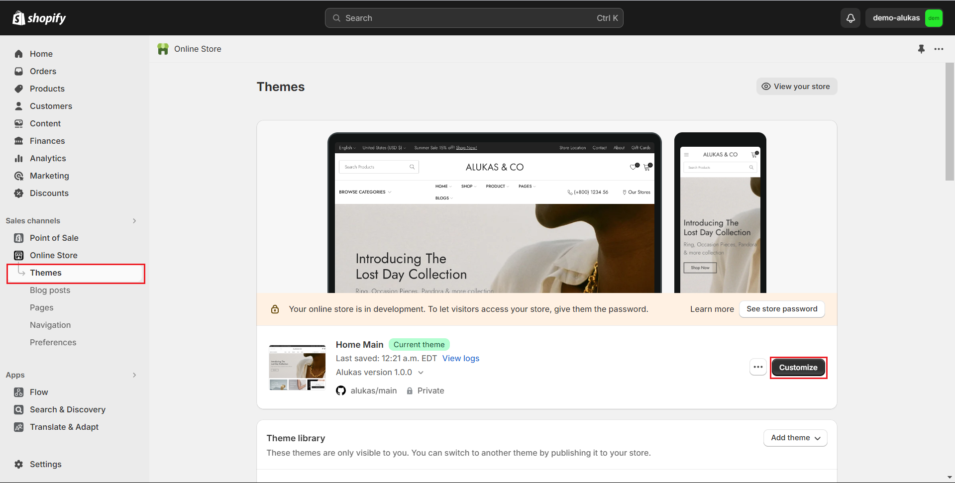 1. From your admin, click to **Online store ==> Themes ==> Customize**