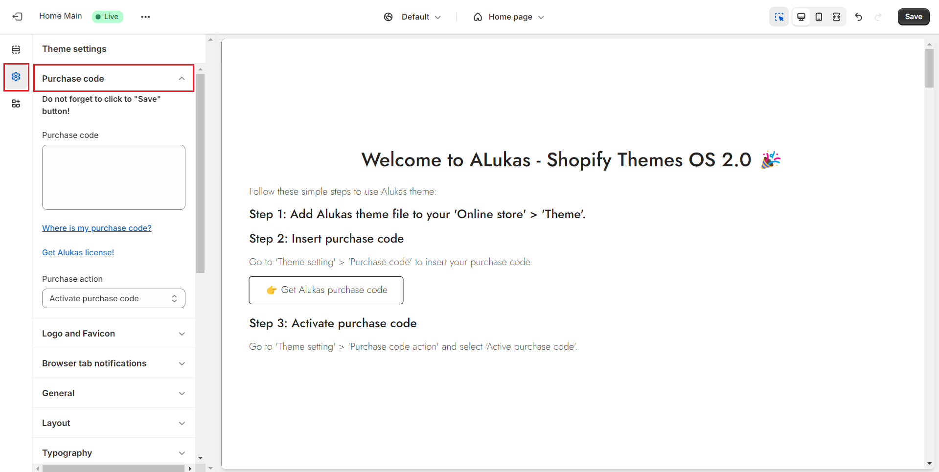 4. Insert your **Purchase Code** and click **Save**