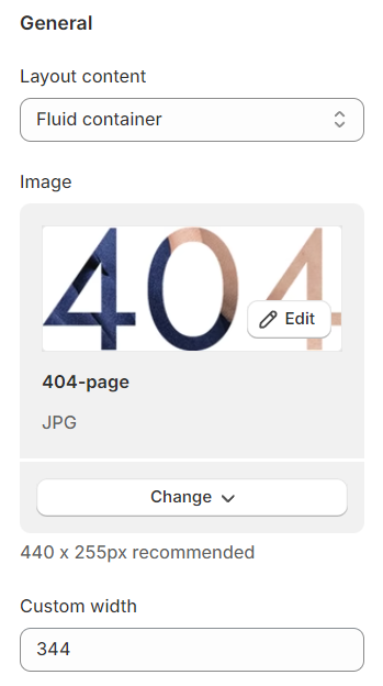 **Custom Width:** Define a specific width for the image to ensure it fits well within the layout of the 404 page, maintaining a cohesive design aesthetic.