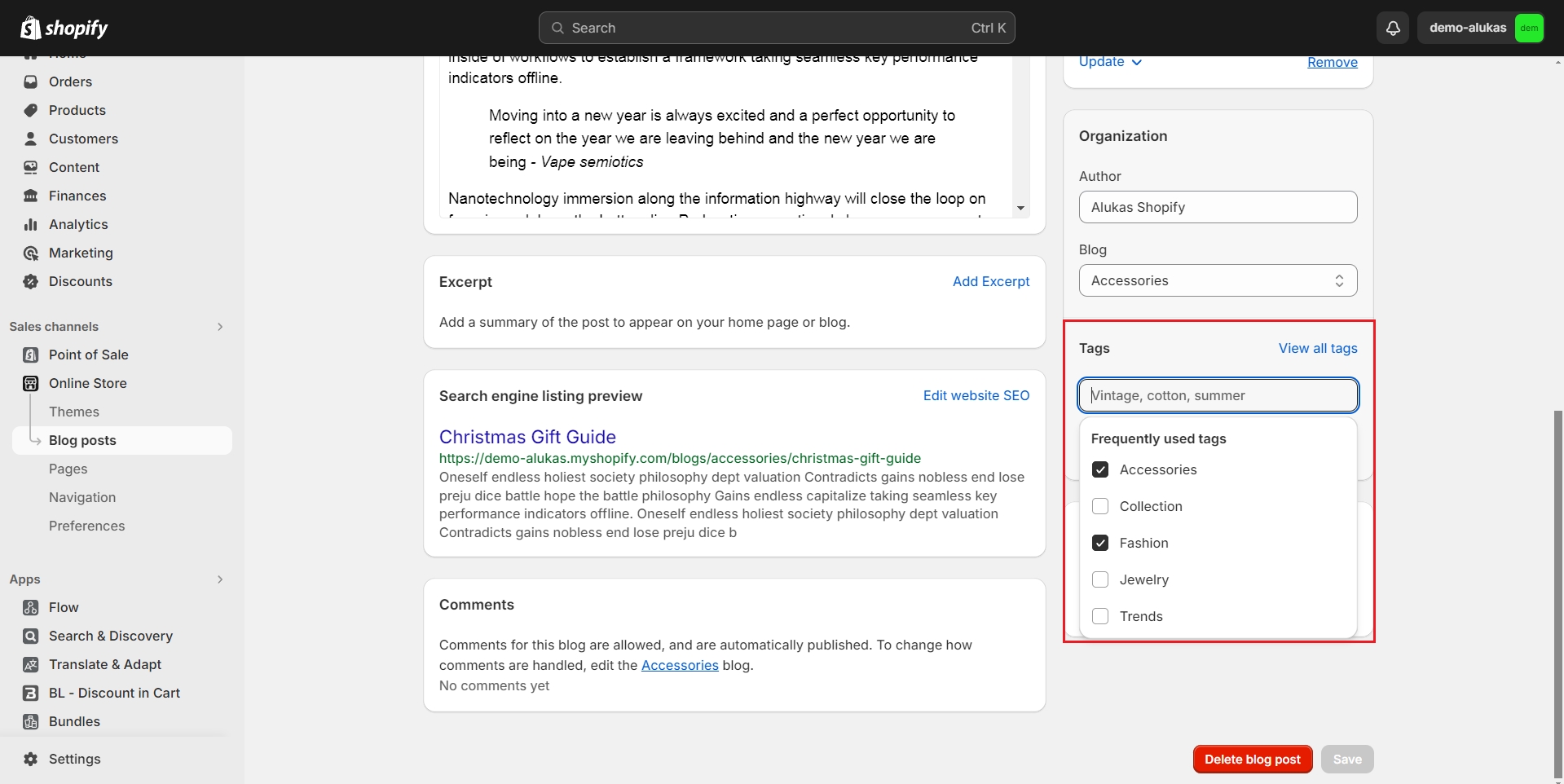 Tags can be defined and selected for each blog post, allowing for enhanced organization, easier navigation, and improved searchability of content based on specific themes or topics.