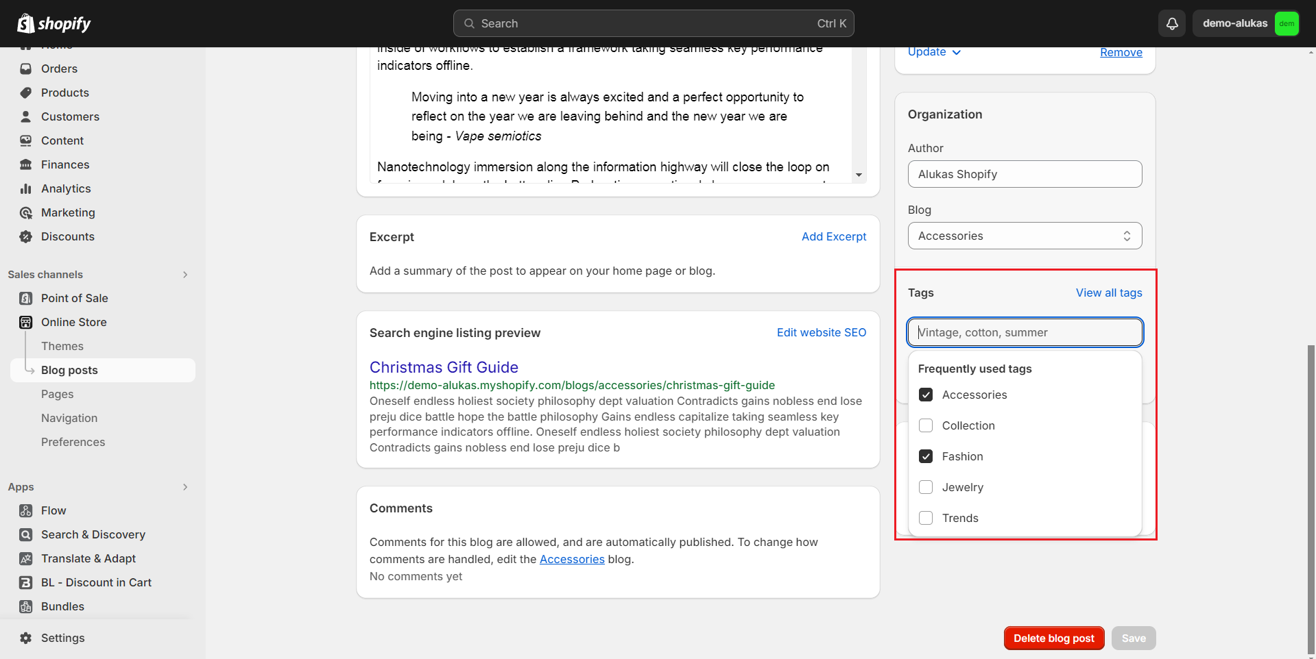 **Tags** can be defined and selected for each blog post, allowing for enhanced organization, easier navigation, and improved searchability of content based on specific themes or topics.