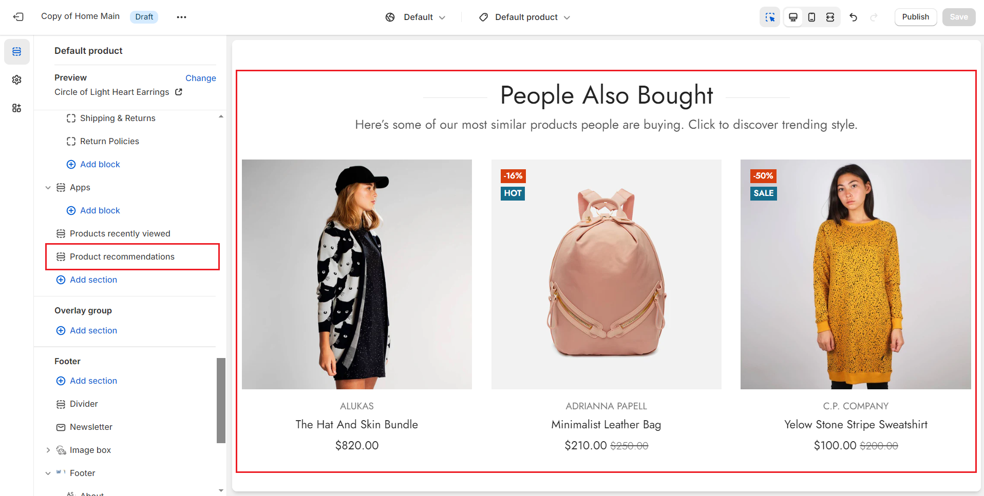 3. On the left-sidebar, add **Product recommendations.**