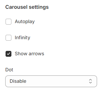 **Show Arrows** and **Dots:** Activate arrows for users to manually swipe through carousel items and dots for a visual indicator of their position within the carousel.