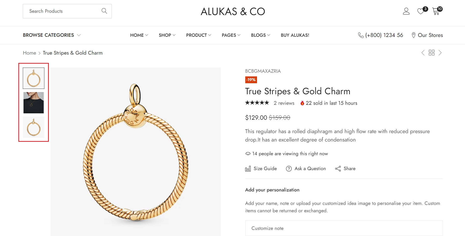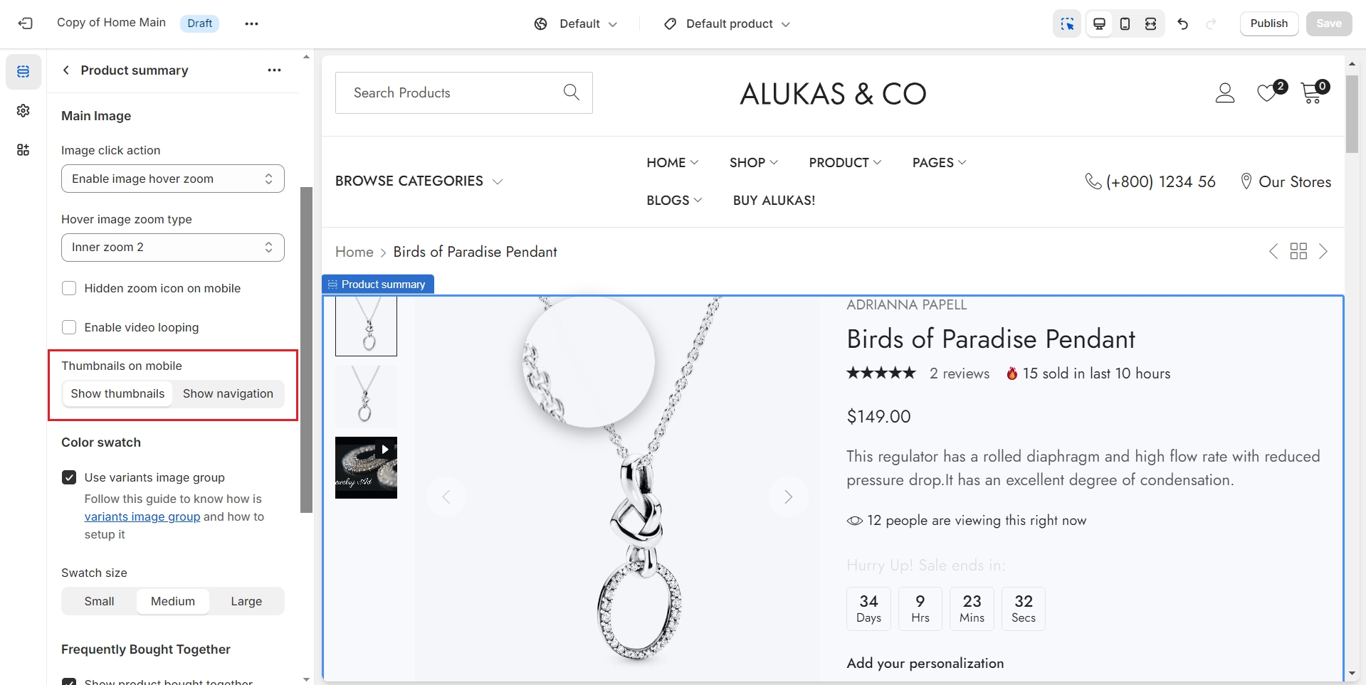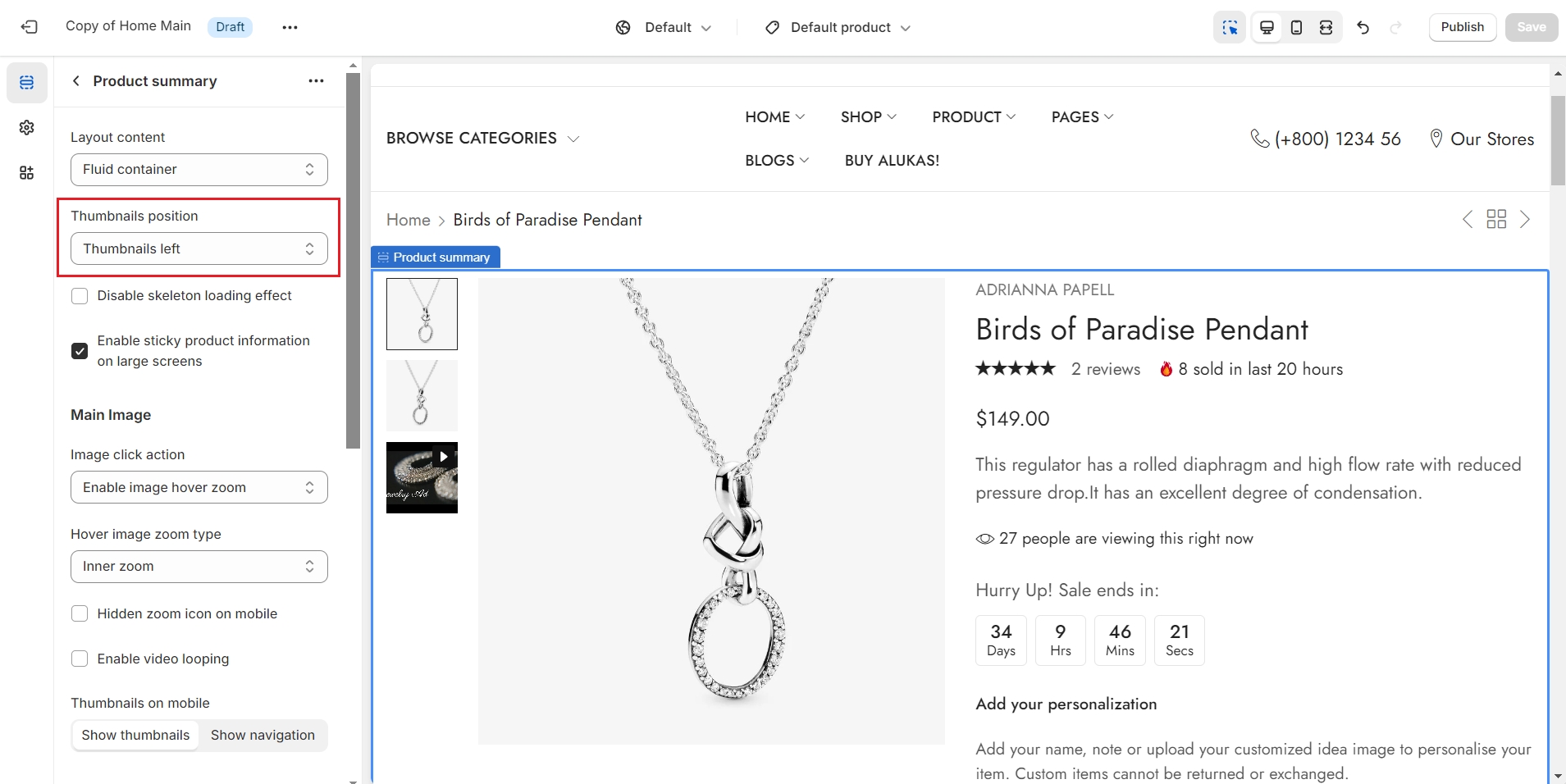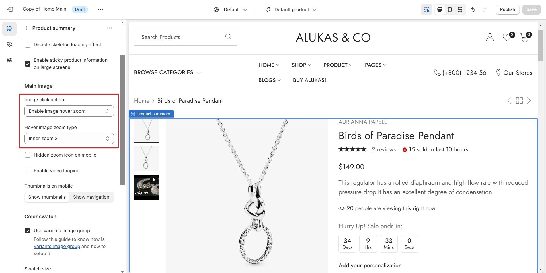 - Go to the Product page > Default product > Product summary > Image click action > Select Enable image hover zoom