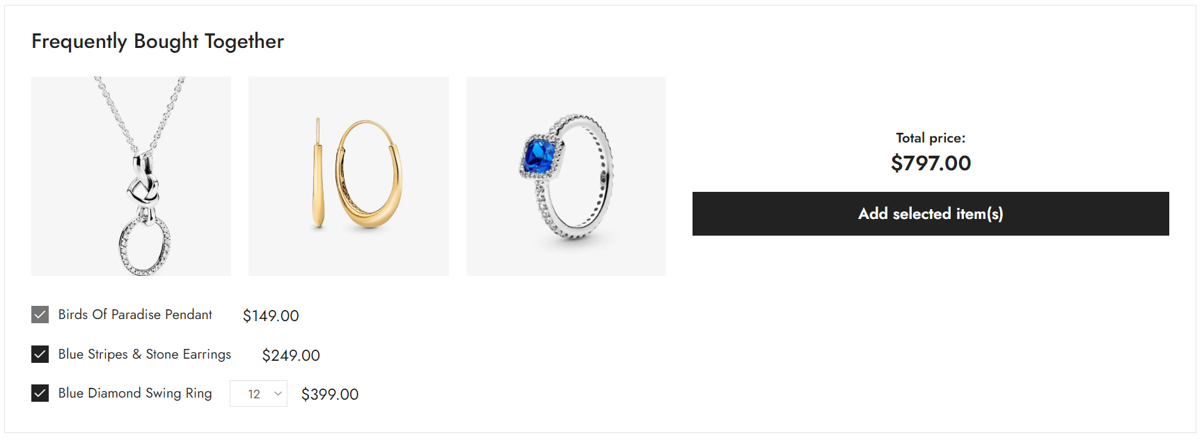 A "Frequently Bought Together" feature on Shopify is a list of products that are recommended to buy together with the product customers viewing.