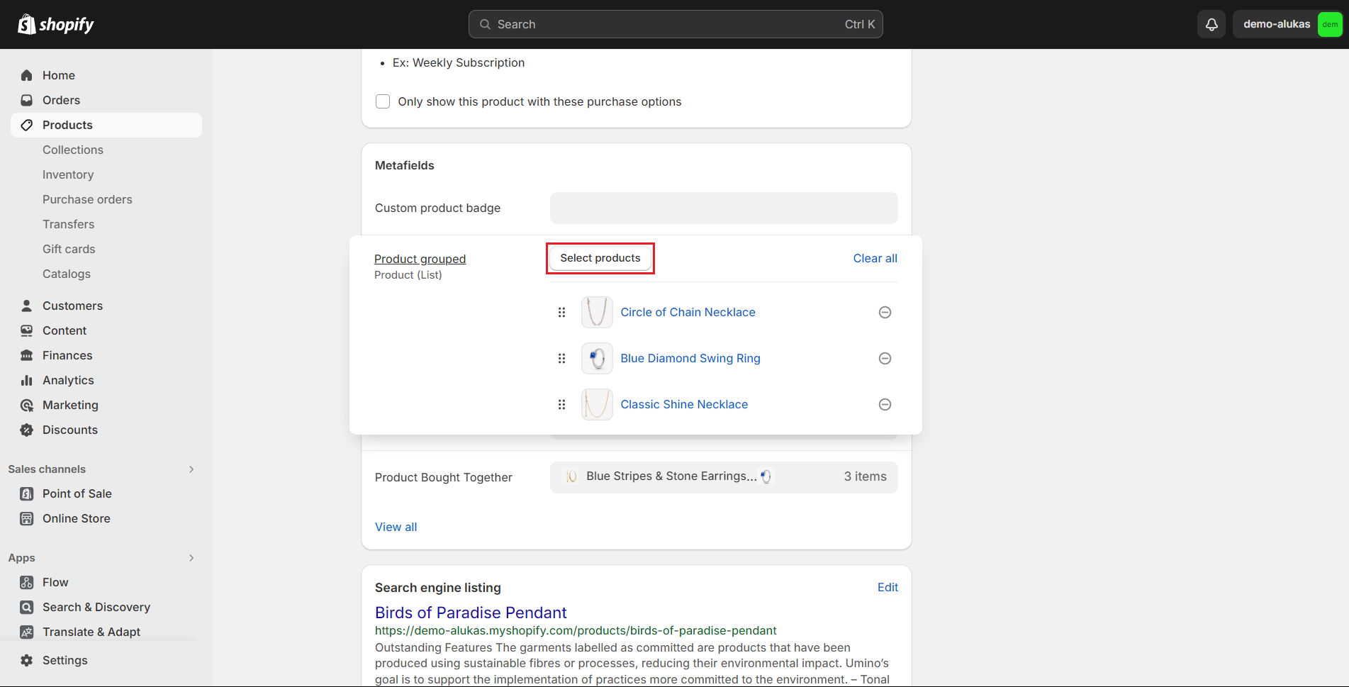 3. Click to **Select Products** and select the products you want to group