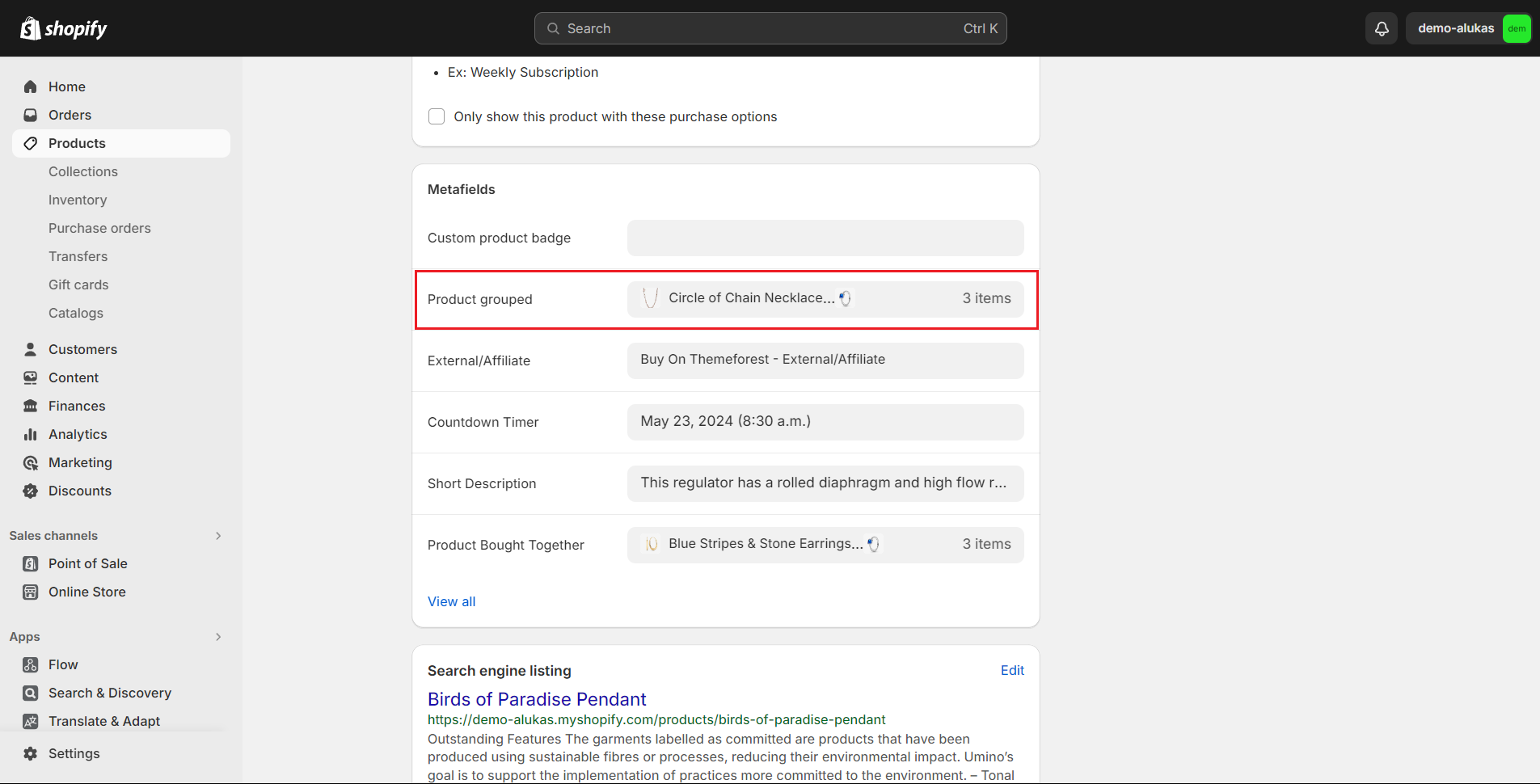 2. Scroll down to **Metafields** and click to Product grouped
