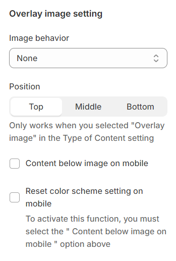 After choosing Content style as Overlay image, this Position options will be able to setup.