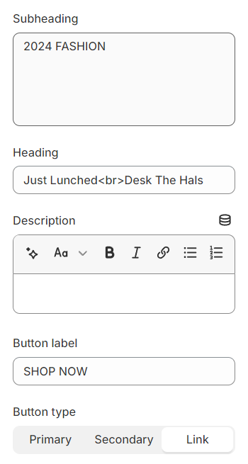 Use the provided text fields to add a suitable heading/subheading/description/button. Leave any of them blank if you do not want to display them.
