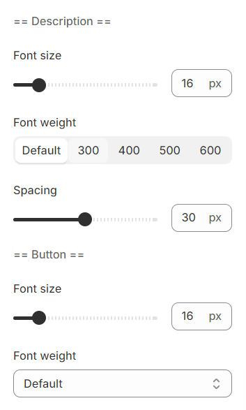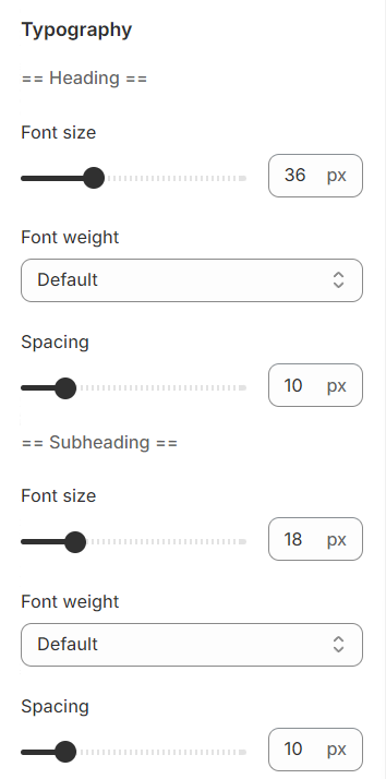 Typography settings include customization options for headings, subheadings, and descriptions. You can adjust the Font size and Font weight for each of these text elements to match your design preferences.
