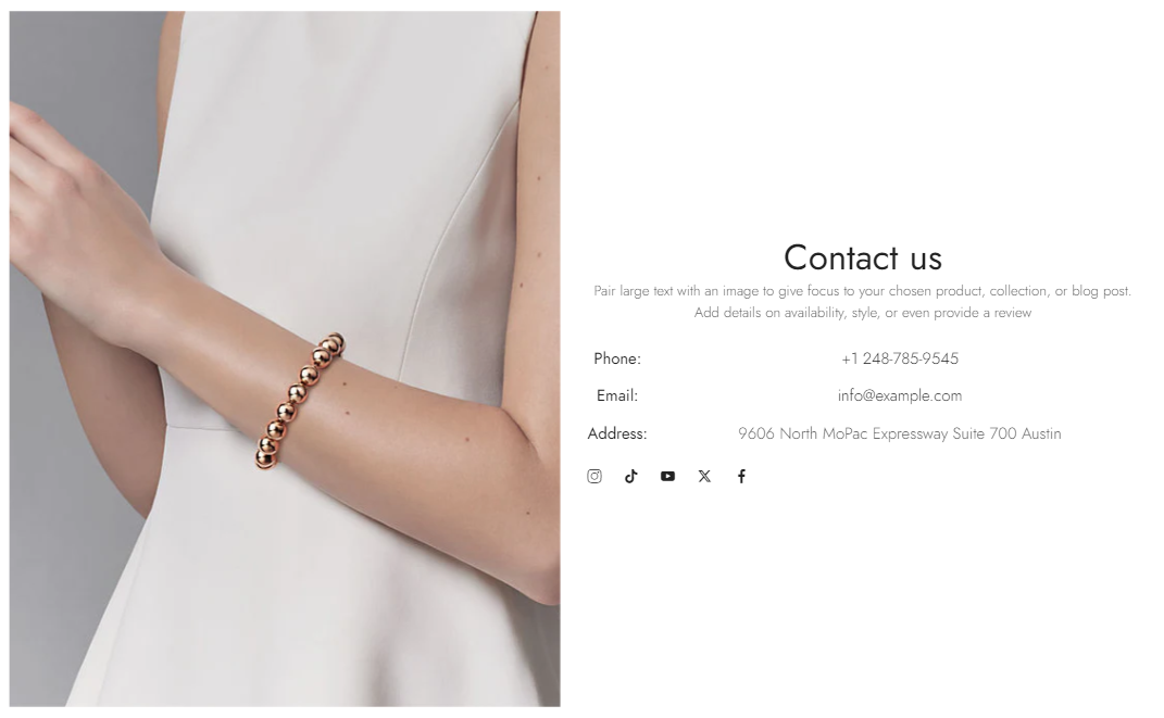 The image with text section provides an appealing and dynamic approach mixing media, message, and a call-to-action button. This is a great way to promote a product/collection or any exciting feature on your online store.