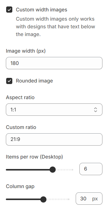 * **Custom width images** and **Image width:** This option lets you customize the size of collection images to your desired dimensions.