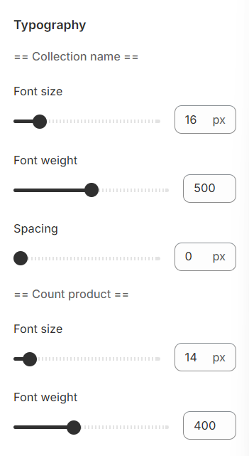 Collection names and product counts' fonts can be separately set up to match the look of your website.
