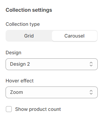 * **Collection type:** The layout of your collection can be configured either as a Grid or a Carousel