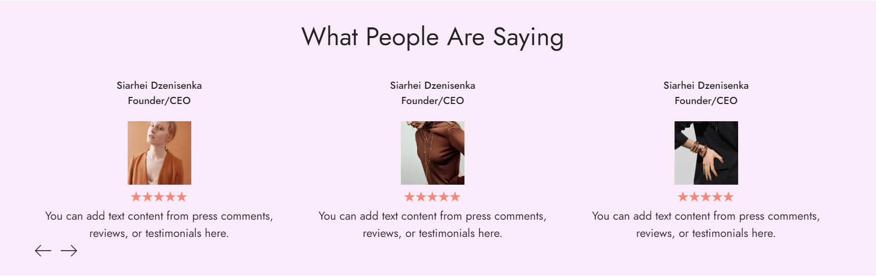 The Testimonials section lets you feature quotes from customers. It's a type of social proof that talks about your brand, service, and overall experience of your existing customers, building confidence and trust in your potential customers.