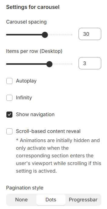 **Autoplay / Infinite Play:** Enable this setting for the carousel to automatically scroll through items indefinitely, providing a seamless browsing experience.