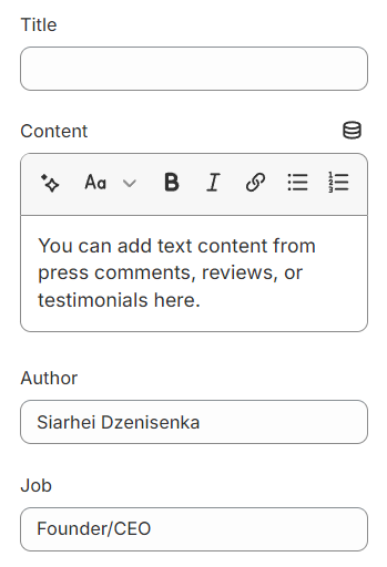 The settings for each testimonial block include various options for configuring the sender's information and avatar. This allows you to personalize testimonials by adding names, roles, or any relevant details about the sender, alongside their photo or logo, enhancing credibility and visual appeal.