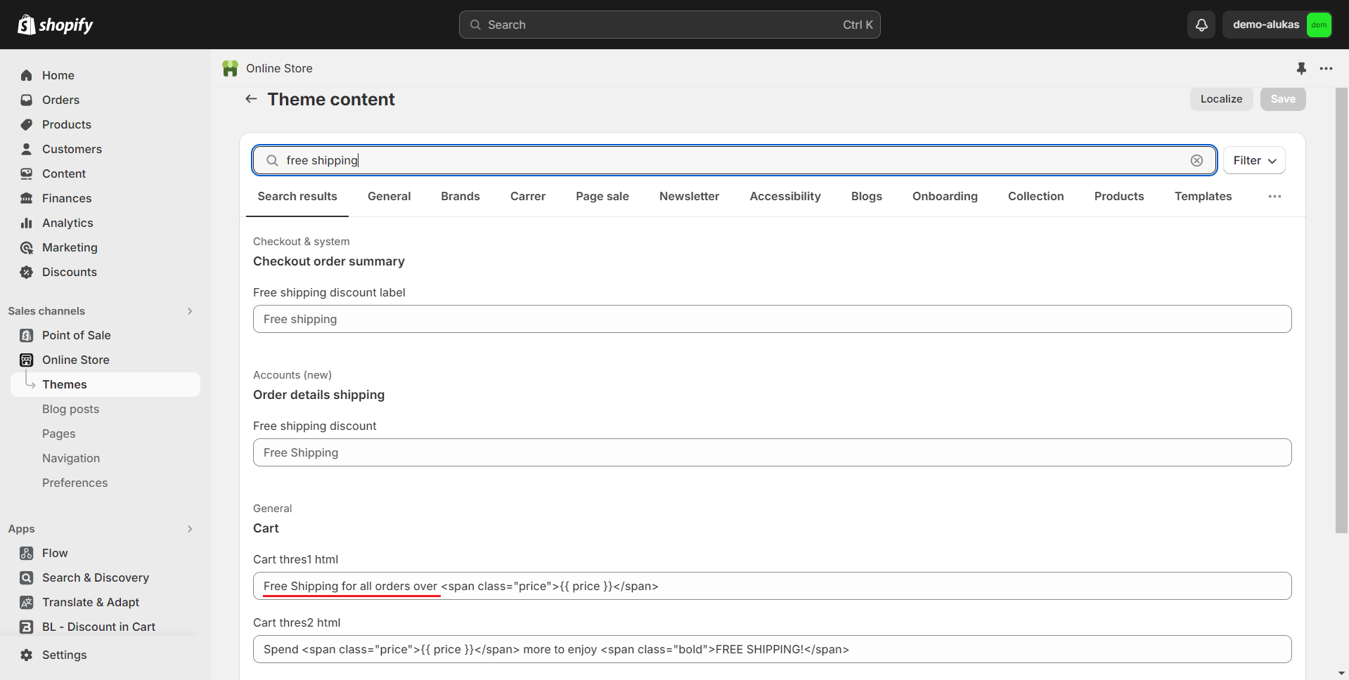 3. Search keywords **"Free shipping"** and edit the message in section **Cart** as you wish