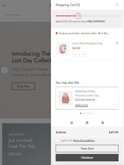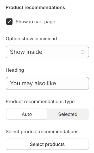 When the Product Recommendations feature is activated, items related to those in your cart will be showcased. You can either let the system automatically select these products or manually choose them according to your preference.