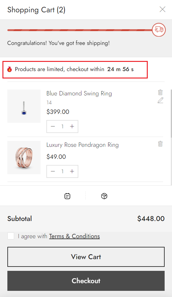 **Cart countdown** is a timer that displays the remaining time until items in the shopping cart are automatically checked out.