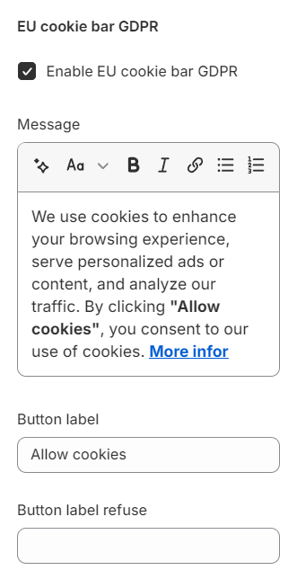 You have the option to enable or disable the cookie bar, along with the capability to customize its content and the text on the accept/reject buttons. This feature offers you control over how you communicate cookie usage to your visitors, aligning with their preferences and regulatory requirements.
