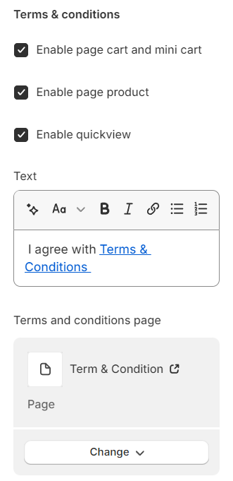 * **Enable page cart and mini cart:** display Term & condition on both cart page and mini cart