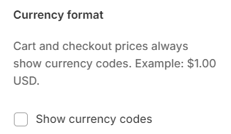 This setting lets you show currency codes in the cart and checkout prices.