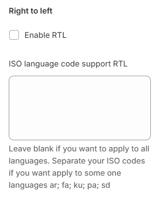 * **ISO language code support RTL**: This option enables the right-to-left (RTL) display of the theme based on the entered language codes. It ensures that the content is rendered correctly for languages that are written from right to left.