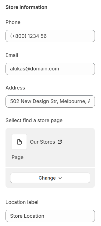 Store information will show up on the top bar, footer and contact us page.