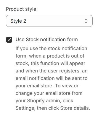 **Use Stock notification form:** Utilizing the stock notification form activates a feature that appears when a product is unavailable. Should a user sign up for alerts, a notification email will be dispatched to your store's email address. To review or modify your store's email, navigate to **'Settings'** and select **'Store details'** from your Shopify admin dashboard.