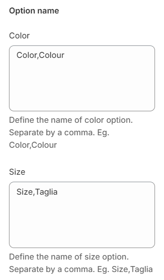 Match the option names to the corresponding language to ensure the **Color swatches** feature works correctly with different languages.