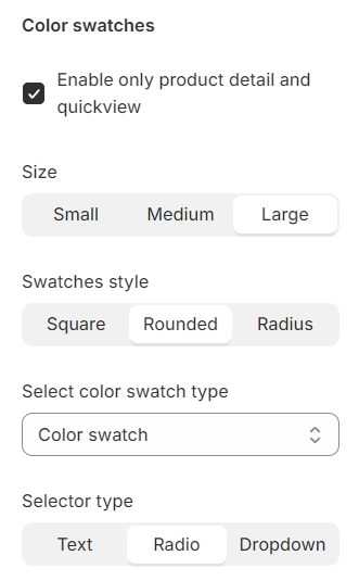 **Color swatches** is used to provide a visual representation of various options available for a product. For instance: color, material, ...