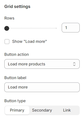 Button action: Choose what happens when the "Load More" button is clicked—either more products are dynamically added to the page, or users are redirected to a collection page for broader browsing.