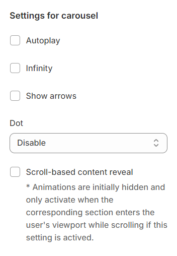 Autoplay / Infinite Play: Enable this setting for the carousel to automatically scroll through items indefinitely, providing a seamless browsing experience.