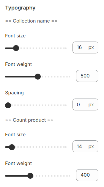 Typography settings include customization options for headings, subheadings, and descriptions. You can adjust the Font size and Font weight for each of these text elements to match your design preferences.