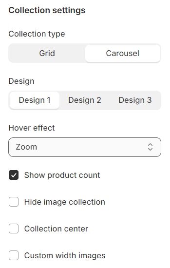Custom width images: Set specific widths for images in the collection for a tailored appearance.