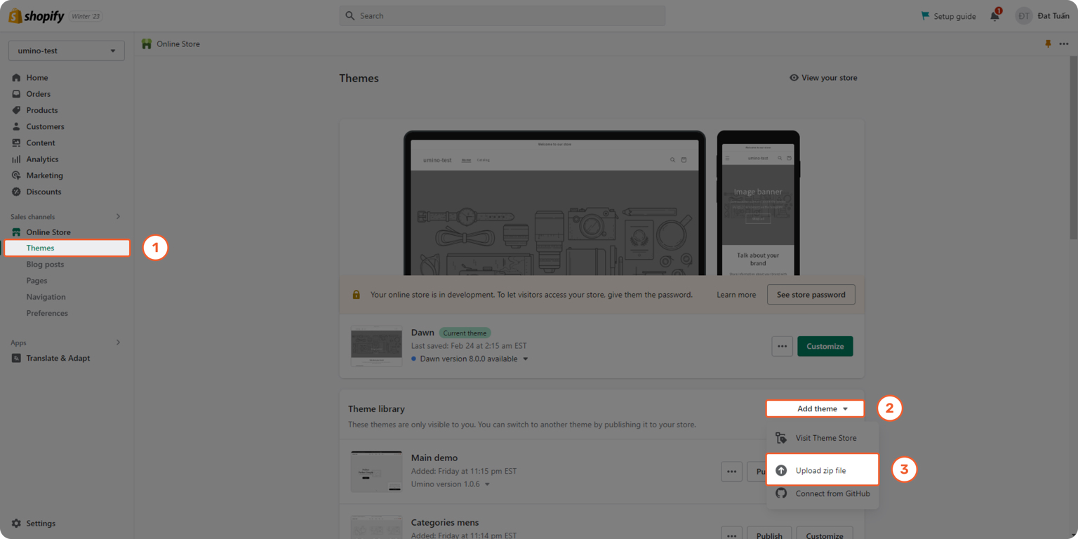 **Step 1:** From your admin, click to **Online store => Themes => Add theme => Upload zip file**