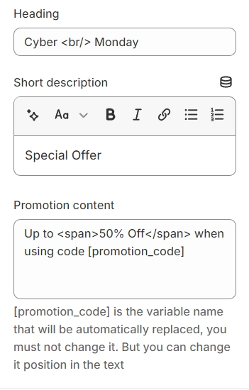 Use the provided text fields to add a suitable heading/description/promotion content. Leave any of them blank if you do not want to display them.