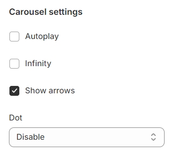 Show arrows and Dots: Activate arrows for users to manually swipe through carousel items and dots for a visual indicator of their position within the carousel.
