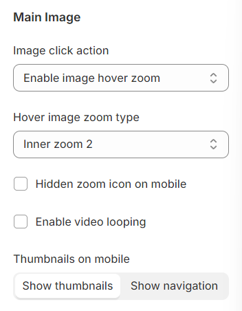 Image click action: Choose between enabling a hover zoom effect on images or using an icon to trigger zoom.