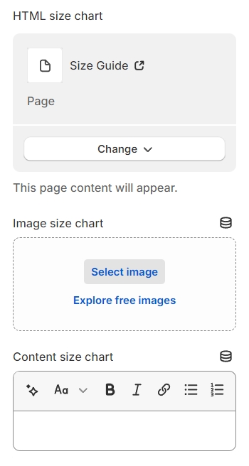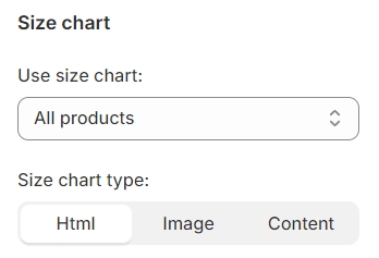 Size chart type: Select the format of the size chart from options including HTML (for customizable text and layout), image (to upload a size chart as an image), or content (to input size information directly as content).