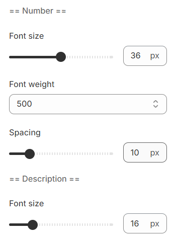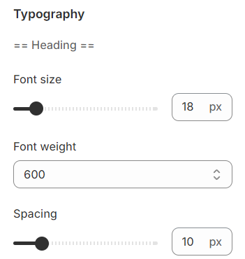 Typography settings include customization options for headings, subheadings, and descriptions. You can adjust the Font size and Font weight for each of these text elements to match your design preferences.