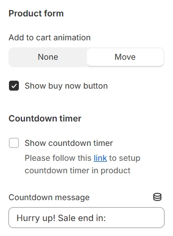You can toggle the Add to Cart animation on/off and activate the Buy Now button. Additionally, you have the flexibility to adjust the countdown timer in this section.
