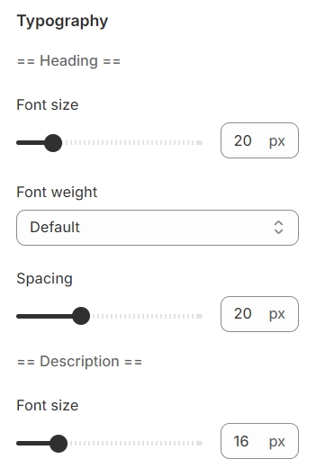 Typography settings include customization options for headings, subheadings, and descriptions. You can adjust the Font size and Font weight for each of these text elements to match your design preferences.