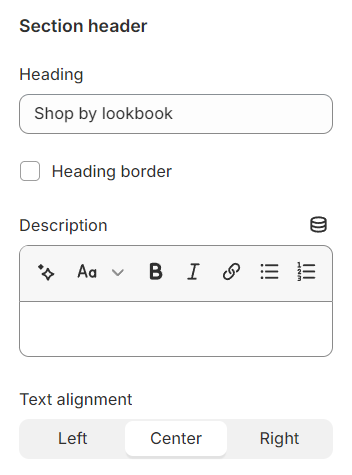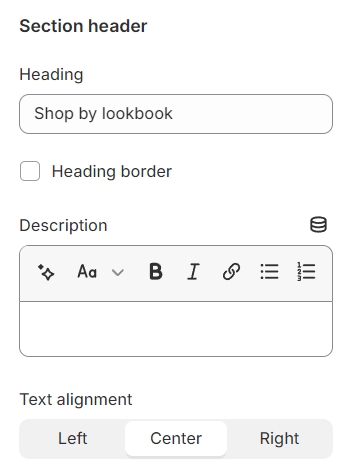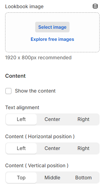Content: Add descriptive text to each lookbook and customize its alignment, along with its vertical and horizontal positioning, to best suit the layout and design.